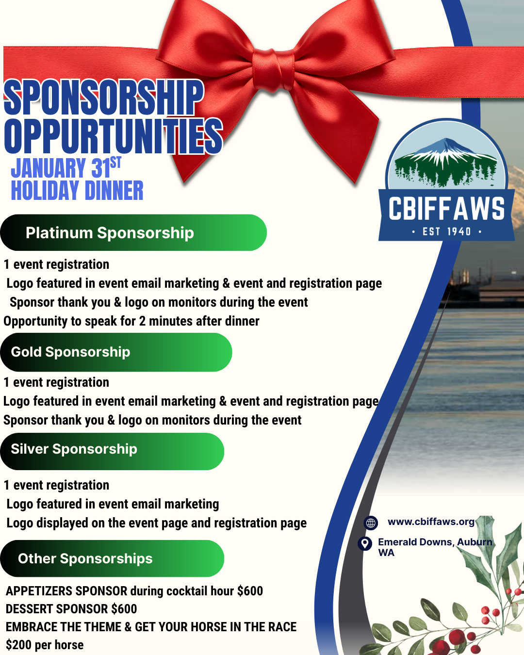 Celebrate a late holiday dinner with your CBIFFAWS friends! The food will be divine, there will be music and mock horse racing and you can't beat the company! Don't forget to bring a raffle item to showcase your company and a friend to join in the fun!